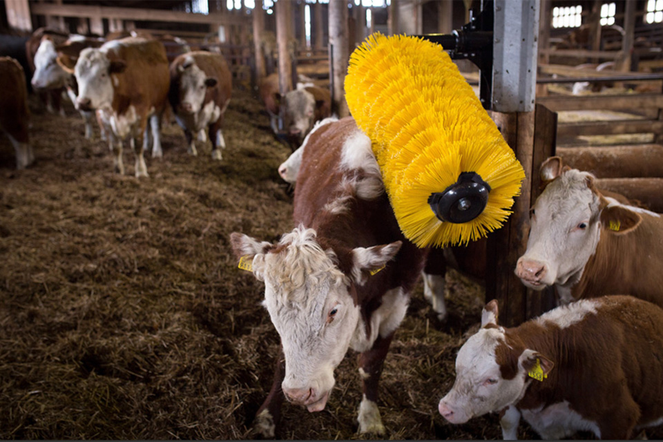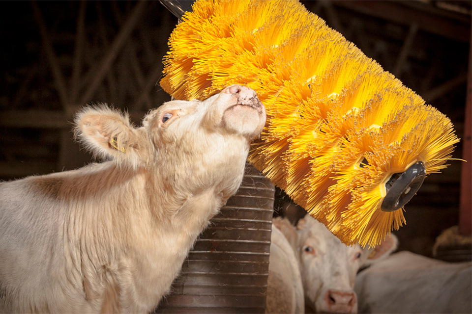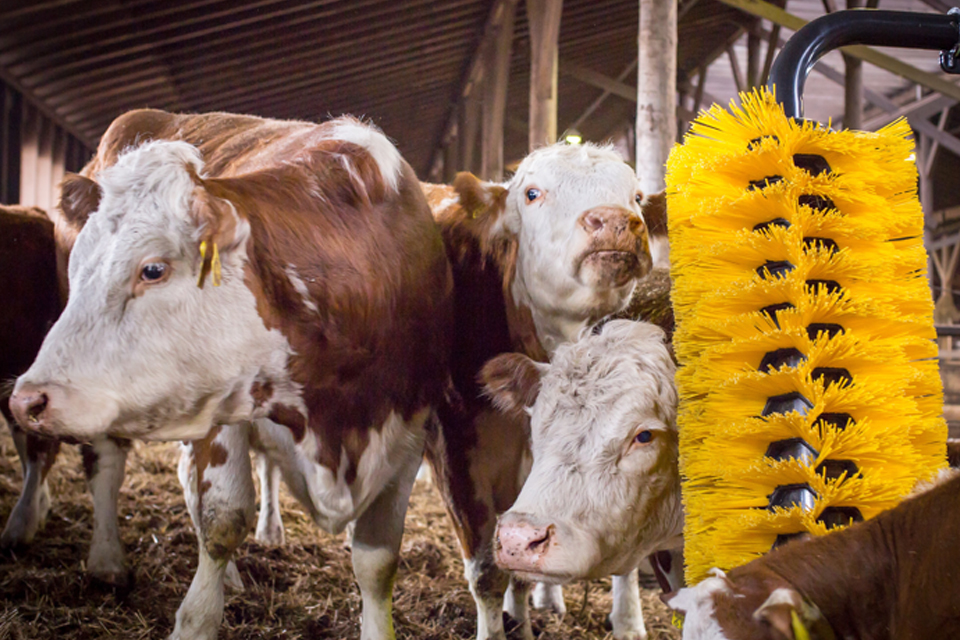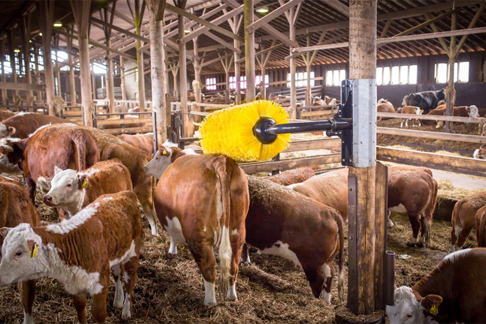 肉牛の肥育場、若い牛、さらには馬やポニー、山羊の為に作られたコンパクトで丈夫なブラシです、電気が不要で一年中屋内又は屋外での使用に最適です。